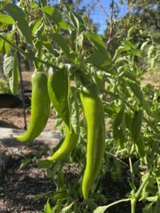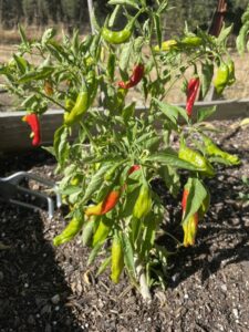 Notes for 2026: Even though they say that crop rotation is not important for home gardeners, I am going to go ahead and use a different bed for the peppers next year. I’ll continue to amend and build the soil with composted pony poop (thank you, Lima Girls!) and kitchen compost. Cover it all for winter with a thick layer of oak leaf mulch. Remember peppers like phosphorus (flower, fruit) so offer bonemeal on the day of planting; any feeding that’s done over the growing season should be phosphorus dominant (higher second number). High nitrogen will produce lots of foliage and not much fruit. Get (make) cages for the peppers as they get established — make the cages out of those wire cattle panels — I’m going to need help with this.