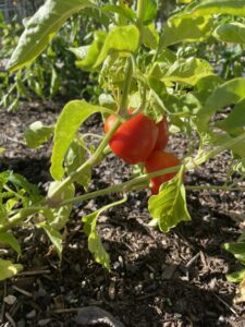 Lots of green fruit on the plants so I’m waiting for them to blush red. Of the five plants I put into the ground, all five are still standing, but again, they needed support to reach their full potential. They flopped over and I had to tie them up on bamboo stakes.